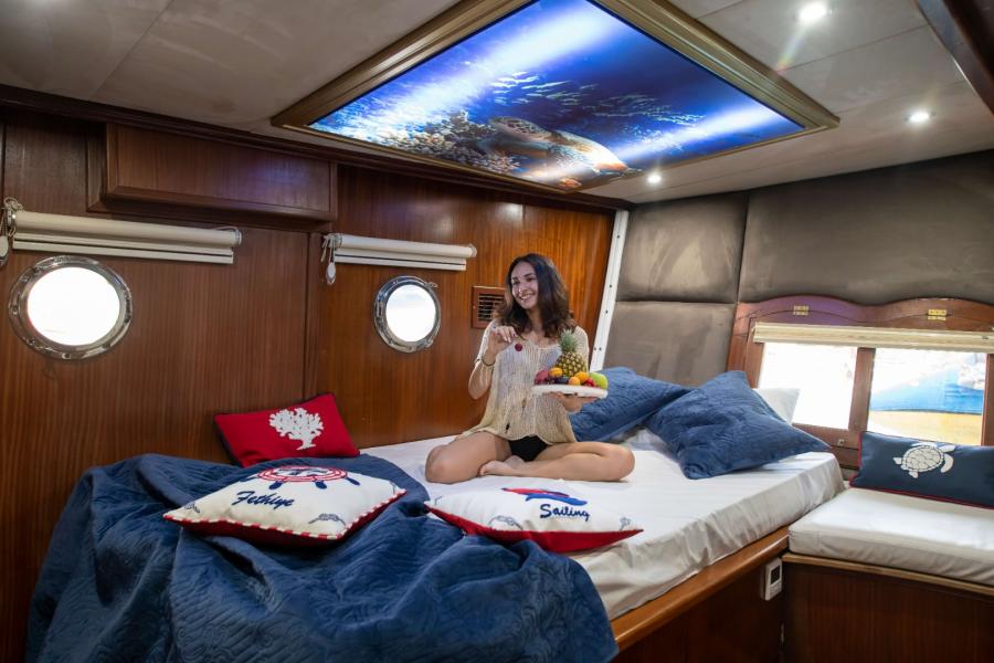 Throughout the journey, guests can experience the beauty of Turkey’s most picturesque cruising regions — including Fethiye, Göcek, Marmaris and Kekova. Each itinerary can be tailored to personal preferences, with opportunities to explore hidden bays, ancient ruins, charming seaside towns, and natural wonders. The gulet also provides snorkelling equipment, paddleboards and other water toys, ensuring a mix of relaxation and fun on the water.