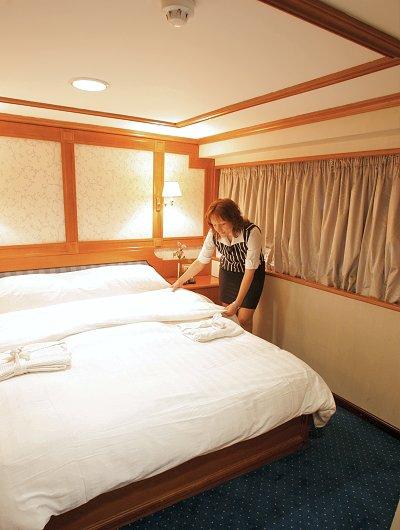 - Bow section cabins are furnished with double beds, others have twin bed setup