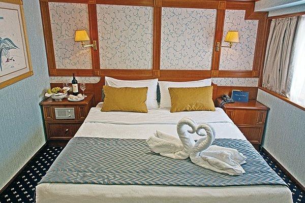 All 17 cabins aboard Callisto are ocean-view, designed with classic marine styling and modern comforts. The cabins are categorized by deck location and window type.
