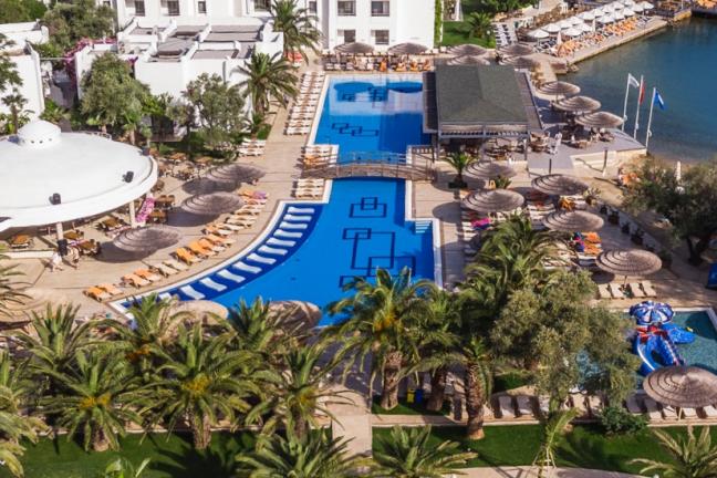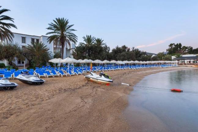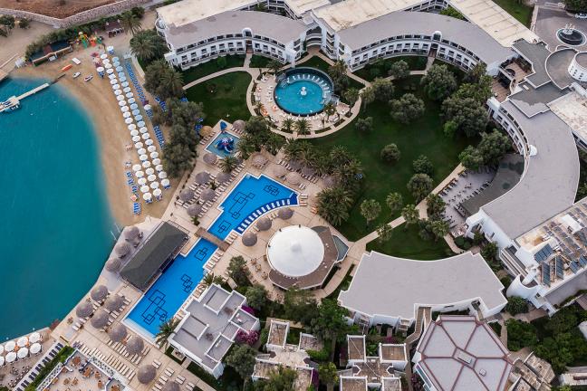 This luxurious beach hotel enjoys an idyllic setting on a small 200 meters-long bay in Torba. The hotel enjoys the exclusivity of a private, sandy, blue-flag beach, where guests are treated to the ultimate in seclusion and intimacy. The hotel is situated just 8 kms from the Centre of Bodrum where guests will experience a delightful feast for the senses with lively sounds from the marketplace, tantalizing aromas and colorful sights to experience. The hotel boasts a magnificent architectural style, exuding sophistication, opulence and unprecedented style. Guests are tempted into the sleek, refined surroundings of the lobby where grand columns add a touch of regal elegance to the environment. The guest rooms are sumptuously designed, featuring soothing neutral tones, tasteful patterns and floods of natural light creating an unequivocal sense of calm and serenity.